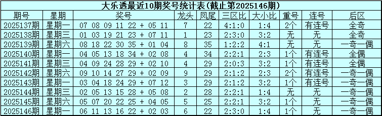 大乐透第2025146期奖号为:06、11、13、16、22+02、03。其中前区三区比为2:3:0,大小比为1:4,包含1个重号,没有出现连号,后区为一奇一偶号码。
