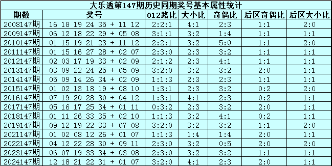 前区大小比推荐:第147期历史同期奖号中,号码大小比总比例为44:36,其中大小比0:5→0次、1:4→1次、2:3→5次、3:2→7次、4:1→3次、5:0→0次,小 号 出现较少,本期重防小 号回补,关注大小比2:3。