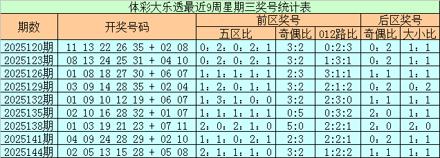 上期回顾:体彩大乐透上周星期三(第2025144期)奖号为02 05 13 15 28 + 05 08,前区奖号五区比为2:1:1:1:0,奇偶比为3:2,012路比为1:2:2,后区奖号奇偶比为1:1,大小比为1:1。