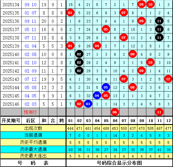 其中,后区奇偶比为16:24,大小比为21:19,012路比为7:18:15,本期后区金胆参考06。