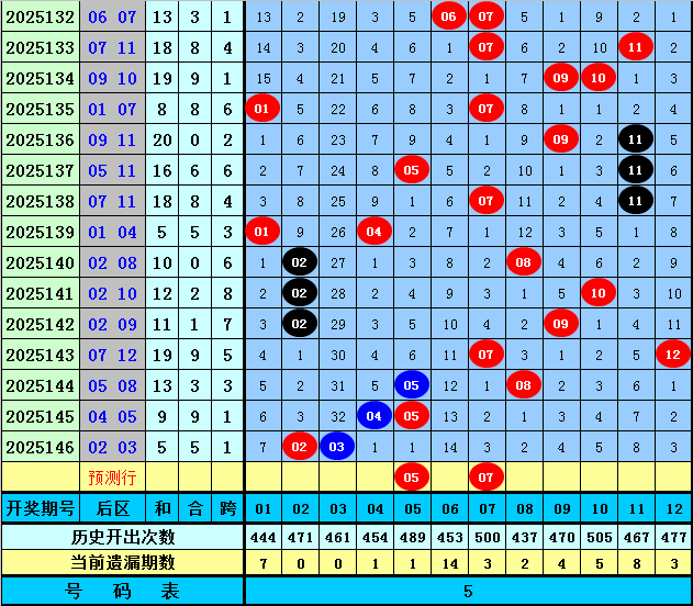 后区分析:上期后区开出奖号02和03,在最近50期开奖中,后区奖号012路落号比为25:34:41,前10期后区012路落号比为3:6:11,本期后区关注号码01、05、07、09、12,两码参考05、07。