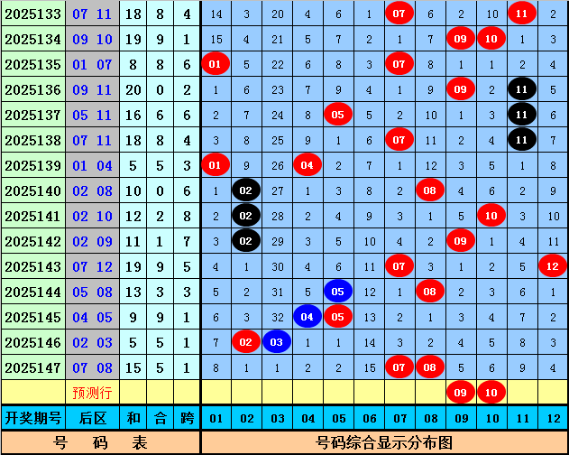 后区第一位分析:在第148期历史同期开奖中,该位号码升重降次数比为9:0:6,出现范围在01-11区间,最近5年后区第一位号码升重降次数比为3:0:2,出现范围在02-08,与最近几年同期号码相比,今年同期预计后区第一位号码继续上升,参考号码09。