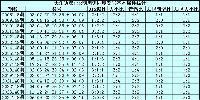 前区大小比推荐:第148期历史同期奖号中,号码大小比总比例为36:44,其中大小比0:5→0次、1:4→5次、2:3→4次、3:2→6次、4:1→0次、5:0→1次,大号开出个数较少,本期看好大号回补,看好大小比3:2。