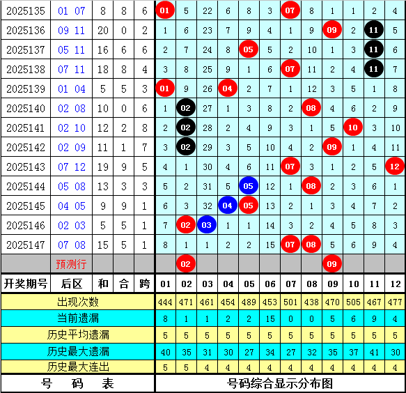 在历史同期奖号中,后区奖号跨度尾数大小比为6:10(定义:跨度1、2、3、10、11为小尾跨度,跨度4、5、6、7、8、9为大尾跨度),其中大尾跨度出现频次较低,本期防大尾跨度回补,参考跨度7。