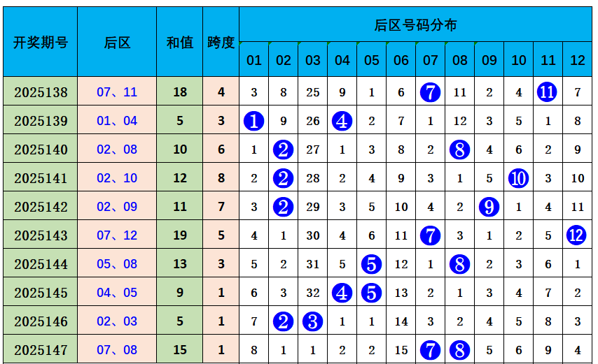 后区上期开出号码07、08,为奇偶组合,近十期后区奇偶比为9:11,偶数走势较高,本期后区参考奇偶比0:2,重点两码推荐02、04。