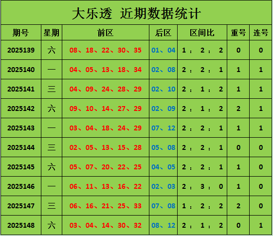 大乐透上期开出奖号:03 04 14 30 32+08 12,区间比是2 : 1 : 2,开出连号03 04,没有开出重号。