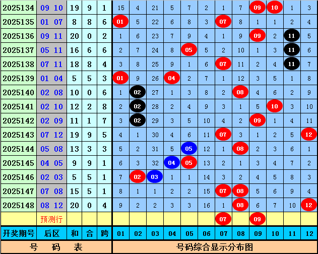 前区三区分布:上期前区奖号三区比为2:1:2,一区奖号为03、04,二区奖号为14,三区奖号为30、32,最近10期前区奖号三区号码比为18:16:16,一区号码表现较热,本期看好三区奖号基本平衡,参考三区比2:1:2。