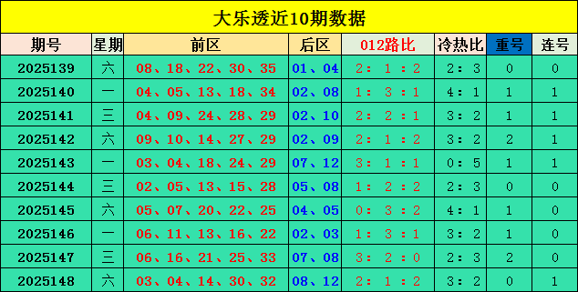 大乐透上期开奖号码:03 04 14 30 32+08 12。前区号码012路比为2:1:2,冷热比为3:2,包含0个重号,1组连码组合03 04,后区开出08 12。