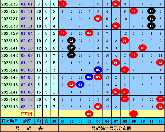 后区分析:上期后区开出2路+0路号05和12,最近30期后区奖号012路比为14:19:27,最近10期后区奖号012路比为5:4:11,本期后区注意号码02、03、04、08、09,单挑两码组合04、09。