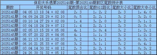 前区尾数质合分析:上期前区包含2个质尾奖号:31、32,开出3个合尾奖号:24、26、30,最近10期前区奖号质合尾数个数比为22:28,合尾奖号走势比较活跃,本期继续重防合尾号码热出,预计合尾奖号出现4个。