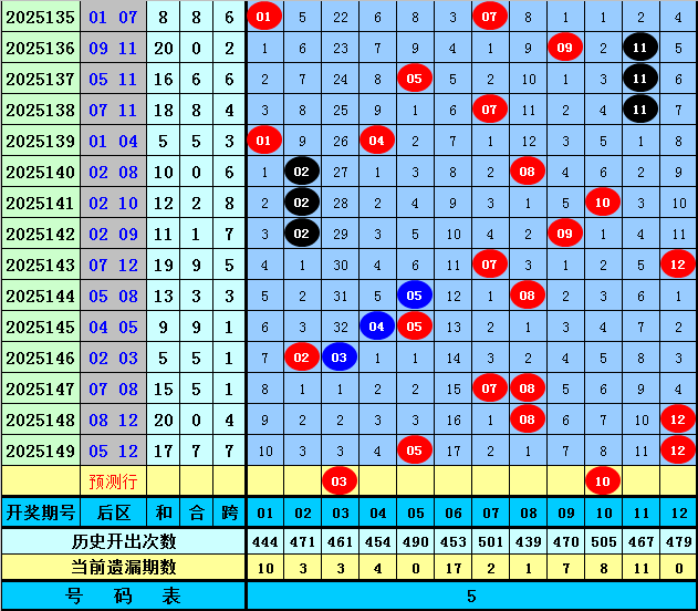 前区第二位推荐:在连续5期开奖中分别出号:07、11、16、04、26,均值为12.8,其中奇数奖号表现较冷,本期适当关注回补,参考奇数号码03。