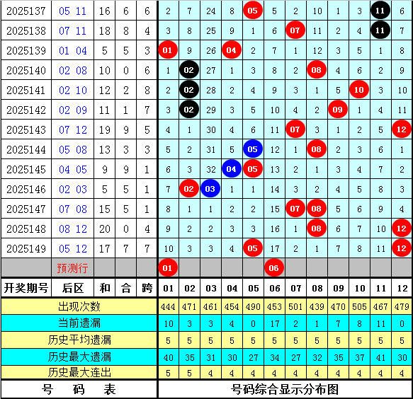 在历史同期奖号中,后区奖号跨度尾数大小比为5:11(定义:跨度1、2、3、10、11为小尾跨度,跨度4、5、6、7、8、9为大尾跨度),其中大尾跨度出现频次较低,本期防大尾跨度回补,参考跨度5。