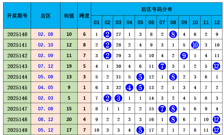 大乐透第2025149期出奖号统计:前区24、26、30、31、32,后区05、12。前区跨度8,龙头24,凤尾32,区间比比0:1:4。
