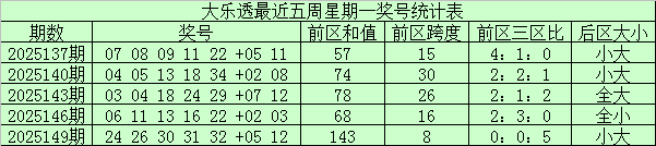 大乐透上周星期一第2025149期开奖,前区:24、26、30、31、32;后区:05、12。其中前区三区比为0:0:5,大小比为5:0,奇偶比为1:4,后区开出一大一小组合。
