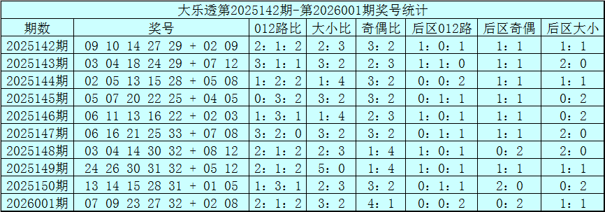 体彩大乐透第26001期奖号为:07 09 23 27 32+02 08,前区奖号012路比为2:1:2,奇偶比为4:1,大小比为3:2,后区为全2路号码。