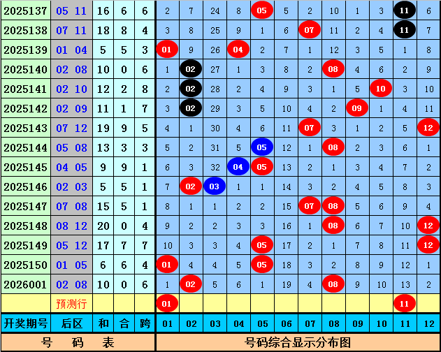 后区上期开出奖号02和08,该组合历史上出现了46次,其下期奖号频次分别为:号码07出现13次,03出现11次,12出现10次,04、10出现9次,02、05出现7次,06、09、11出现6次,01出现4次,08出现2次,本期后区参考号码01、04、08、11,精选两码01和11。