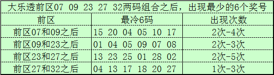 前区冷码统计:大乐透第26001期前区奖号为:07、09、23、27、32,截止第26001期历史上大乐透已经开出了2819期奖号了,在连续两码奖号中: