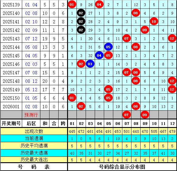 石浩第2026002期大乐透后区分析:后区上周星期一后区奖号为05和12,上期开出奖号02和08,最近9周星期一与最近9期后区奖号奇偶比分别为9:9和8:10,大小比分别为12:6和9:9,本期后区注意全大组合,参考号码07、09、11、12。