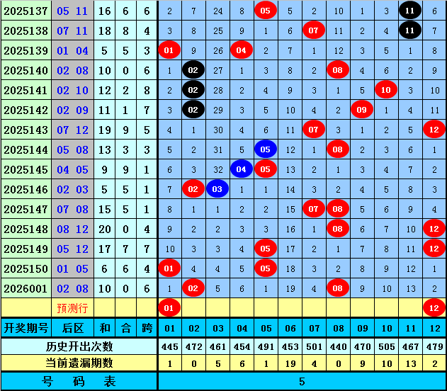 后区分析:在第002期历史同期开奖中,后区奖号奇偶比为19:19,最近5年同期后区奇偶走势为:全奇、全偶、一奇一偶、一奇一偶、一奇一偶,今年同期看好再出一奇一偶组合,关注号码01、12。