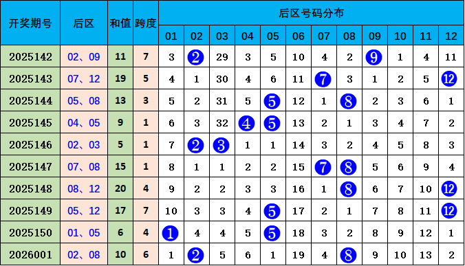前区和值分析:上期开出和值98,近10期和值在63-143之间,近十期和值平均值是90.3,本期预测和值有下降趋势,关注和值出现在80-85区间。