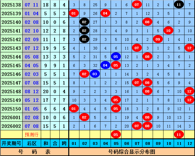 三少第2026003期体彩大乐透后区尾数分析:上期后区开出奖号07和08,奖号尾数为1路和2路,本期后区排除0路尾数号码,五码参考01、05、06、08、11。