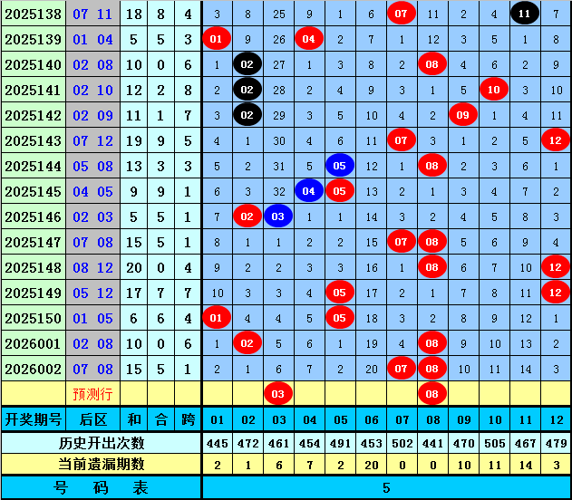 后区分析【一区01-04,二区05-08,三区09-12】:上期后区奖号为07和08,全部出现在第二区,近50期后区三区比为29:40:31,近10期三区比为5:12:3,本期注意第一、二区号码出现,关注两码03+08。