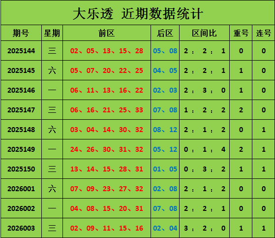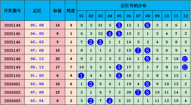 上期后区开出号码02 04,和值6,近十期和值13 9 5 15 20 17 6 10 15 6,和值波动范围较大,本期预测和值会上升,重点关注号码:07 08,和值15。