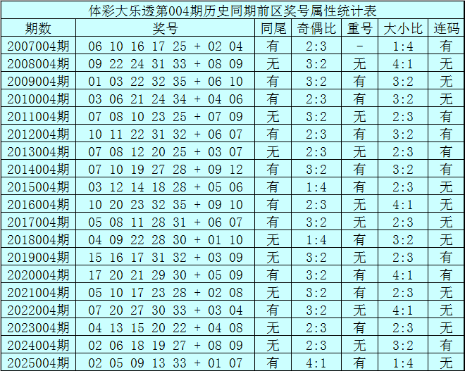 体彩大乐透第004期历史同期开出19次奖号,其统计详见下表: