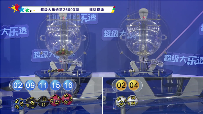 上期开奖:体彩大乐透第2026003期开奖号码为:02 09 11 15 16 + 02 04。