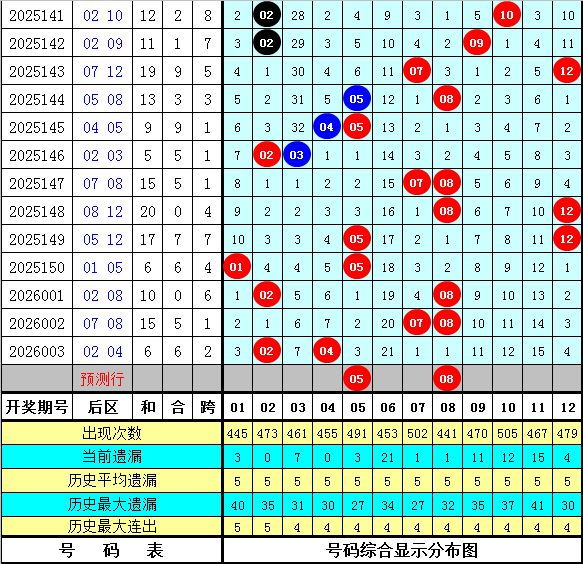 其中,后区奇偶比为15:25,大小比为20:20,012路比为6:17:17,本期后区金胆参考05。