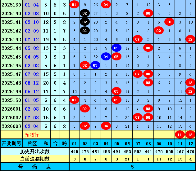 后区分析(定义:01-04为一区,05-08为二区,09-12为三区):上期后区开出奖号02和04,全在第一区出现,最近10期后区三个区间落号个数比为7:11:2,本期后区看好第三区号码大热,注意两码11、12。