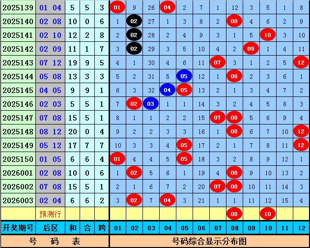 后区分析:上期该位开出奖号02和04,和值为6,跨度为2,后区前4次开出和值6和跨度2时,其下期奖号分别为:05+11、02+07、04+05、02+11,号码奇偶比为5:3,大小比为3:5,012路比为0:2:6,本期后区号码参考01、03、08、09、10,精选两码08、10。