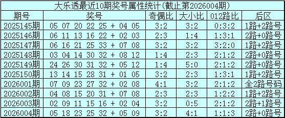 大乐透第2026004期开奖号码:05 18 23 25 32 + 05 09。前区奖号大小比为4:1,奇偶比为3:2,012路比为1:1:3,后区为2路+0路号。