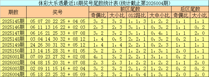 上期回顾:体彩大乐透第2026004期开出号码:05 18 23 25 32 + 05 09,其中前区奖号尾数奇偶比为3:2,大小比为3:2,012路比为1:0:4,大中小比为1:3:1,后区奖号尾数奇偶比为2:0,大小比为2:0。