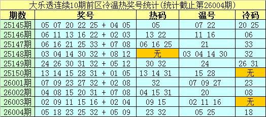 开奖回顾:体彩大乐透第26004期开出奖号:05 18 23 25 32 + 05 09,前区号码和值为103,大小比为4:1,跨度为27,奇偶比为3:2。后区为热码+冷码。