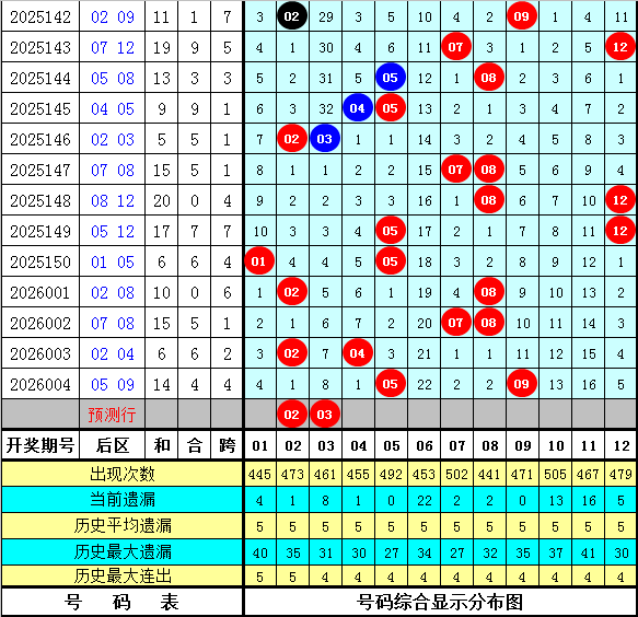 后区判断:上期后区奖号为05和09,开出热码+冷码组合。最近十期后区开出12个热码、5个温码和3个冷码,本期预计奖号关注热码+温码组合,参考两码02、03。