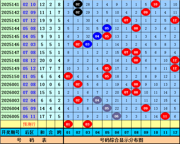 012路分析:上期前区奖号012路比为0:2:3,最近两周2路前区奖号走势较热,0路前区奖号表现较冷。