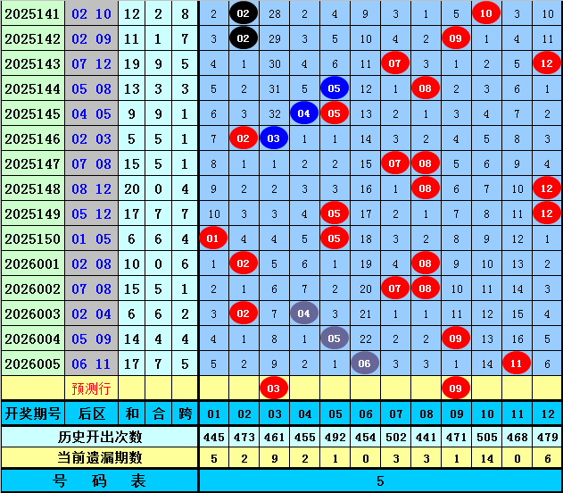 后区分析【一区01-04,二区05-08,三区09-12】:上期后区奖号为06和11,分别落在第二、三区,近50期后区三区比为29:40:31,近10期三区比为6:10:4,本期注意第一、三区号码出现,关注两码03+09。