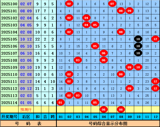 后区号码分析:第115期历史同期开奖中,后区两码全大开出2次,全小开出1次,一大一小开出14次,本期后区预计出现一大一小奖号,参考号码02、06、08、11。