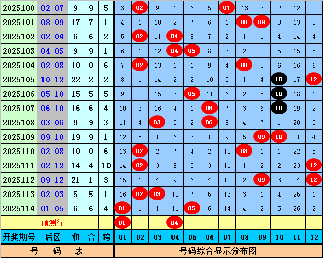后区分析:在第115期历史同期开奖中,和值大小为9:8,跨度奇偶比为10:7,本期后区注意两码01和04。
