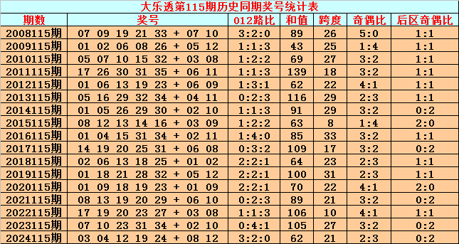 综上所述,大乐透第2025115期前区012路比参考2:0:3。