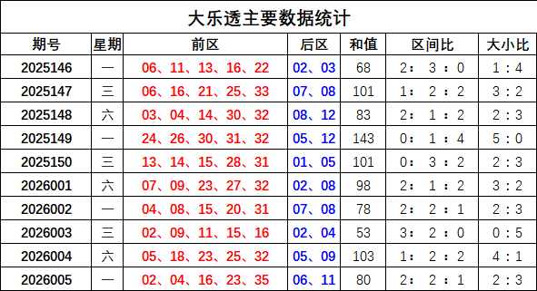 上期回顾:大乐透上期奖号为:前区02 04 16 23 35,后区06 11,前区奖号和值为80,区间比2:2:1,大小比为2:3,