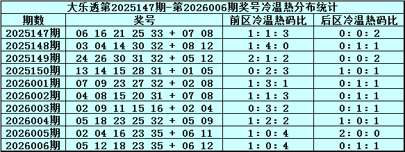 体彩大乐透第26006期奖号为:05 12 18 23 35+06 12,前区奖号奇偶比为3:2,012路比为2:0:3,大小比为3:2,遗漏总值为23,后区号码遗漏总值为6。