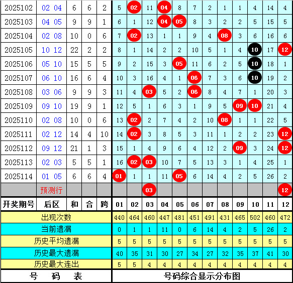 后区判断:上期后区奖号为01和05,开出冷码+温码组合。最近十期后区开出9个热码、8个温码和3个冷码,本期预计奖号关注热码+热码组合,参考两码03、12。