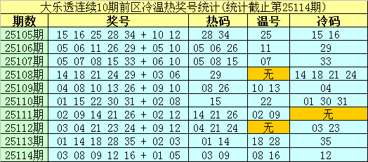 大乐透第25105期-第25114期前区奖号冷温热分布统计: