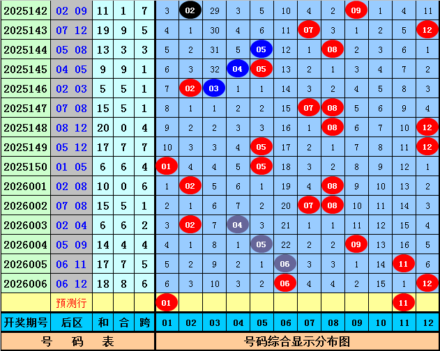 后区分析:在第007期历史同期开奖中,和值大小为9:10,跨度奇偶比为11:8,本期后区注意两码01和11。