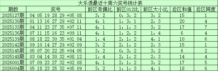 前区奇偶走势:上期前区奇偶比为3:2,上周六前区奇偶比3:2,最近十周六奇数号码表现占优,本期注意偶数号码回补转热,关注奇偶比2:3。