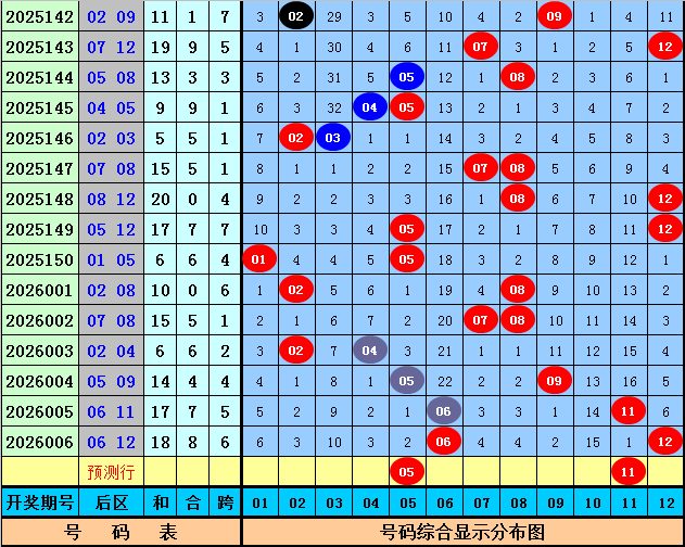 后区分析:上期后区奖号为06+12,开出一大一小组合,上周六后区奖号开出05+09,最近十周六后区奖号大小比为11:9,大小 号码走势基本相当,本周六看好大小 号码继续平衡,关注两码05、11。