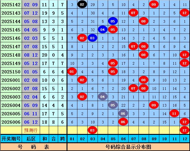 后区奖号分析:上期后区开出奖号06+12,奖号和值为18,跨度为6,本期预计后区和值转小,关注两码03 12。