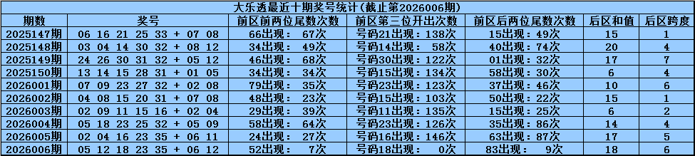 体彩大乐透第2026006期奖号为:05 12 18 23 35+06 12,前区号码大小比开出3:2,012路比开出2:0:3,奇偶比开出3:2,后区号码和值开出18,跨度开出6。